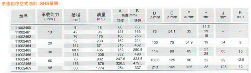 單作用中空式油缸-SHS系列規格: